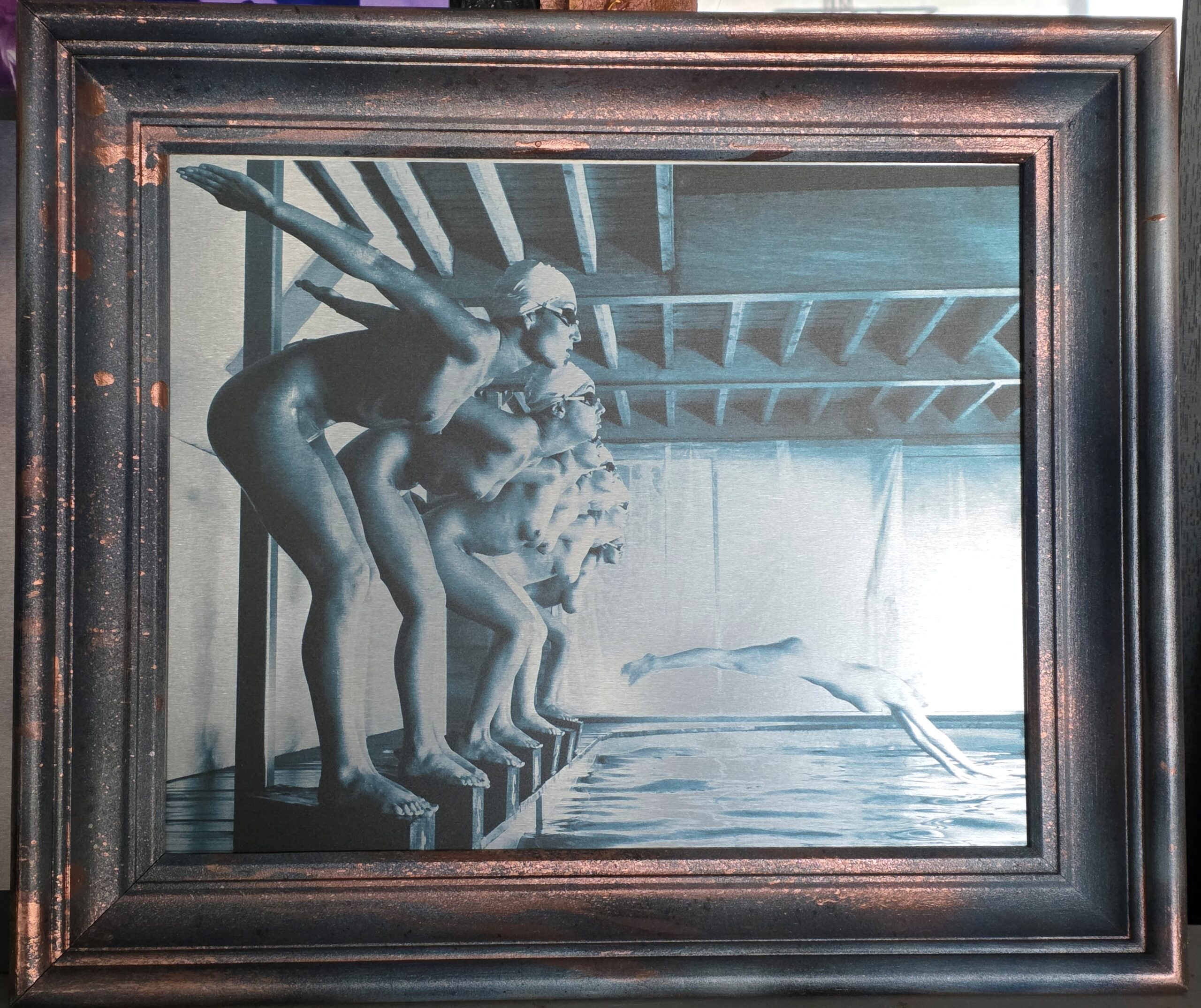 False start, pool ladies photo-shoot, blue-toned print on aluminium, Michael Joseph