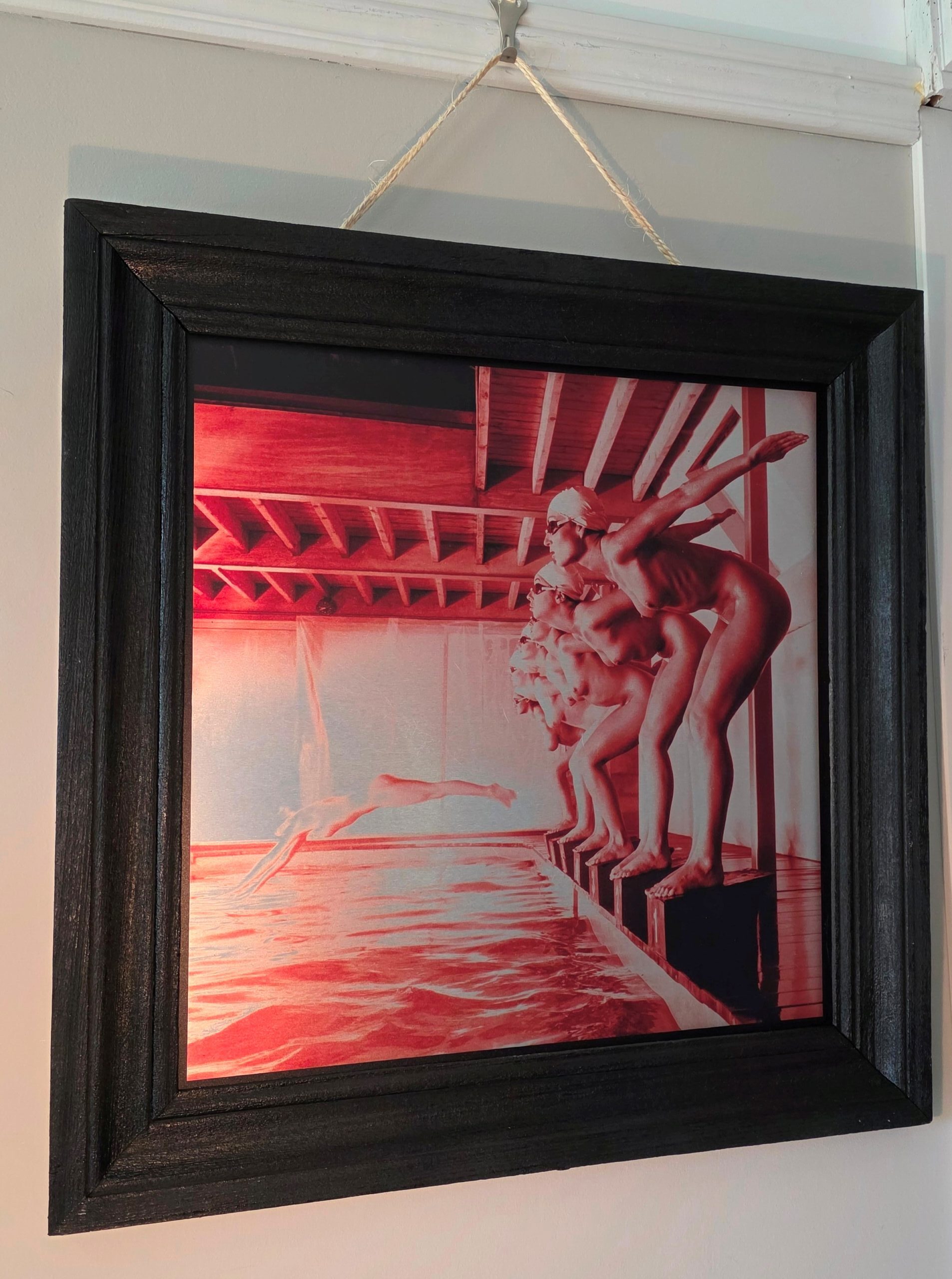 False start, pool ladies photo-shoot, red print on aluminium, Michael Joseph