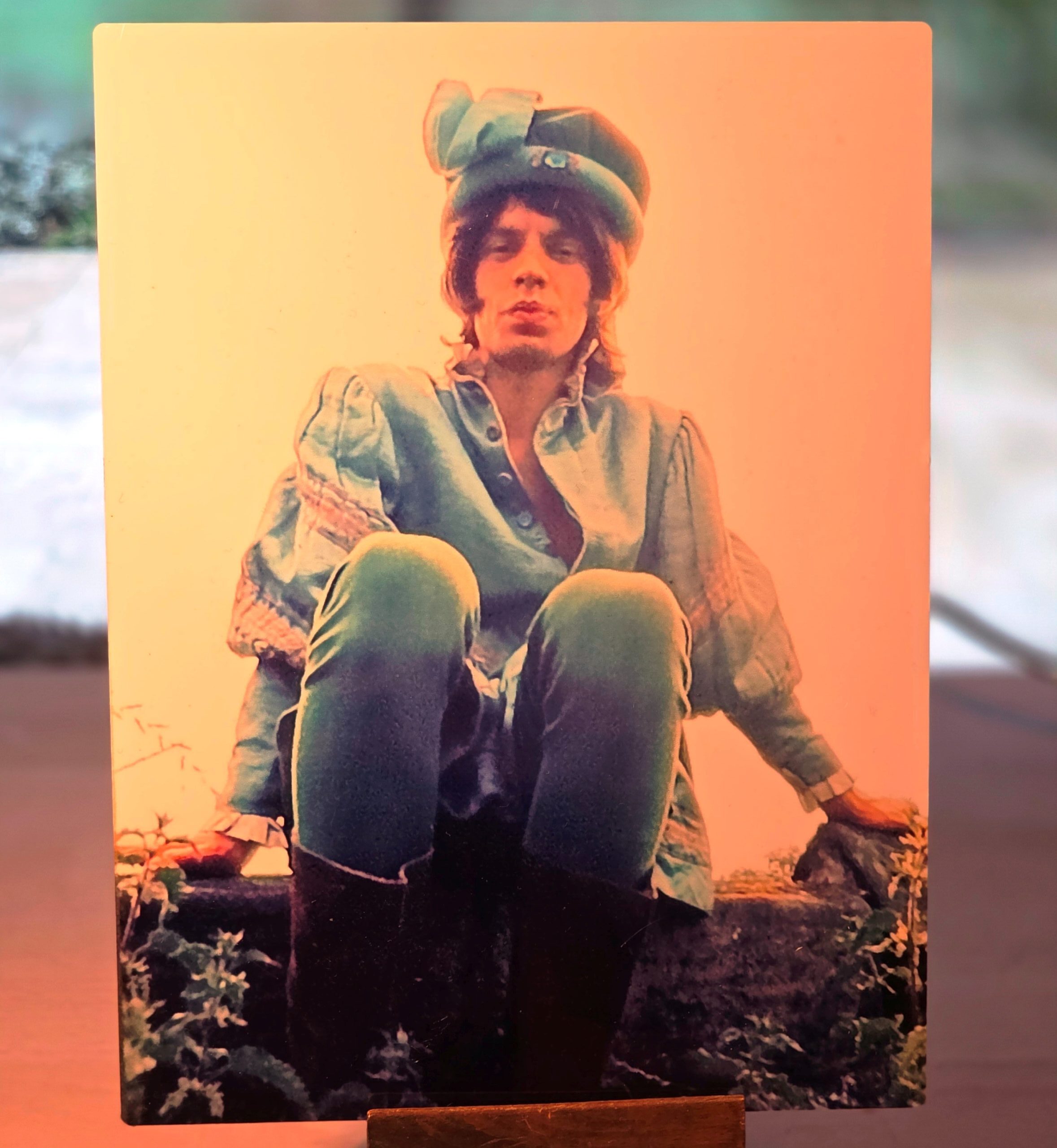 Portrait de Mick Jagger avec une poule sous son bras - tirage ayant été plastifié et signé par Michael Joseph